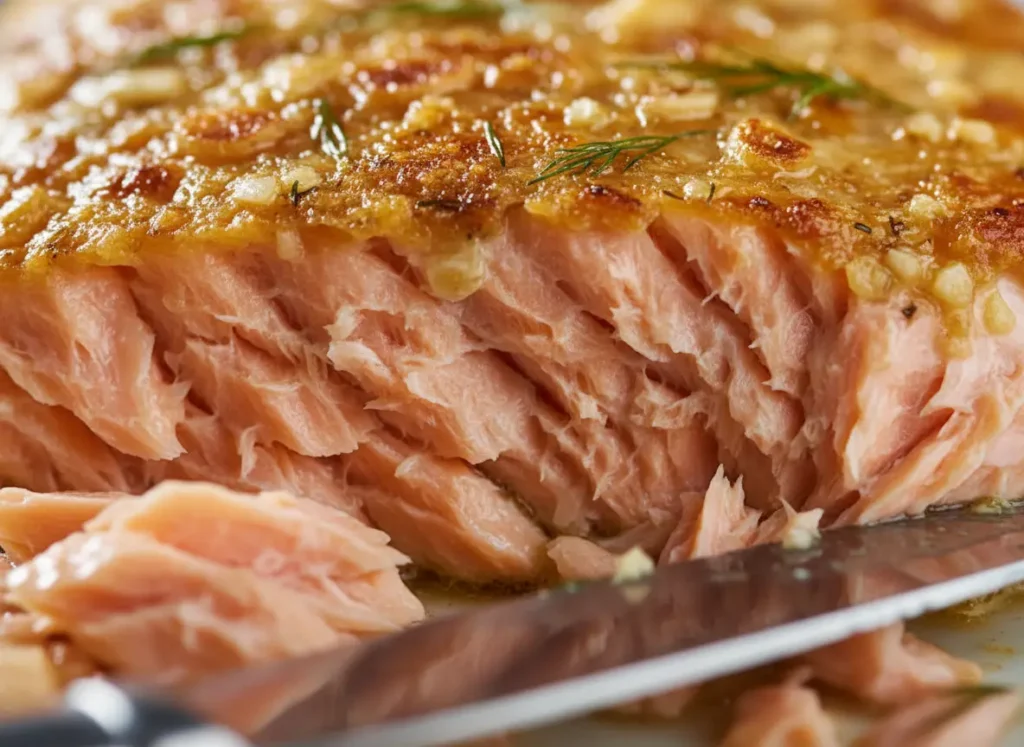 The first bite is a textural revelation. Your fork meets a slight, satisfying resistance—a “bouncy” quality that signifies perfectly cooked protein—before sliding through layers of vibrant pink flesh that are glistening with internal moisture. It’s a maximalist explosion of savory roasted garlic, bright acidic lemon, and rich, velvety butter that coats your palate. This isn’t the sad, dry, “fishy” smelling salmon you avoid at the office potluck. This is restaurant-quality seafood that tastes like luxury but took less time to cook than boiling a pot of pasta.