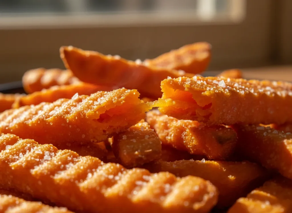 The first bite is a culinary victory lap—a sharp, crystalline crack as your teeth break through a paper-thin, golden-orange ridge that is dusted with coarse sea salt. This isn’t the soggy, limp, burnt-at-the-tips sweet potato fry you get from a standard oven tray. It’s a maximalist explosion of texture: a “shatter-crisp” exterior that yields to a velvety, “Gimme Gummy” interior that is impossibly sweet and earthy. Served with a spicy-smoky aioli, it’s a snack that feels like an indulgence but is actually a fiber-forward, gut-health powerhouse.