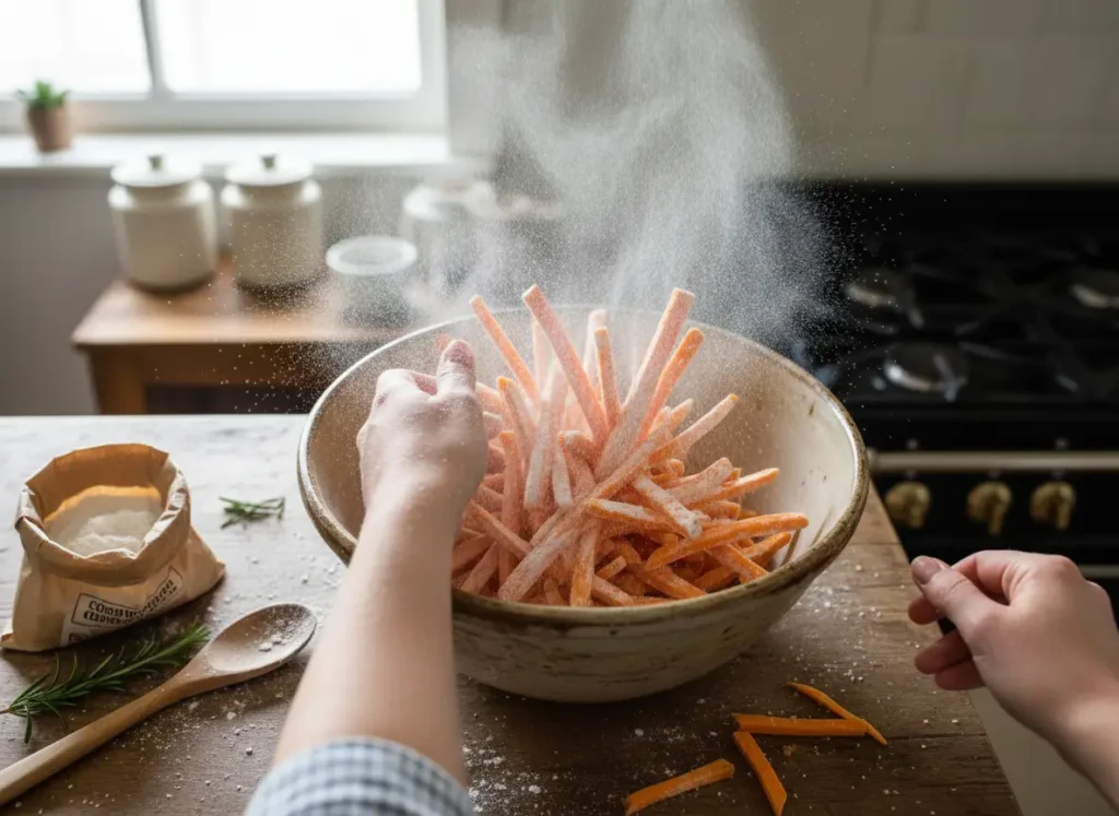 We start with the “Knife Work.” As you slice through the dense orange flesh, focus on uniformity. It’s meditative, and it’s crucial. Plunge them into the ice-cold water bath and watch the water turn cloudy—that’s the excess starch leaving the building. After the “Bone-Dry” towel-off, toss them in the cornstarch “snowstorm.” Every fry should be lightly dusted, not caked.