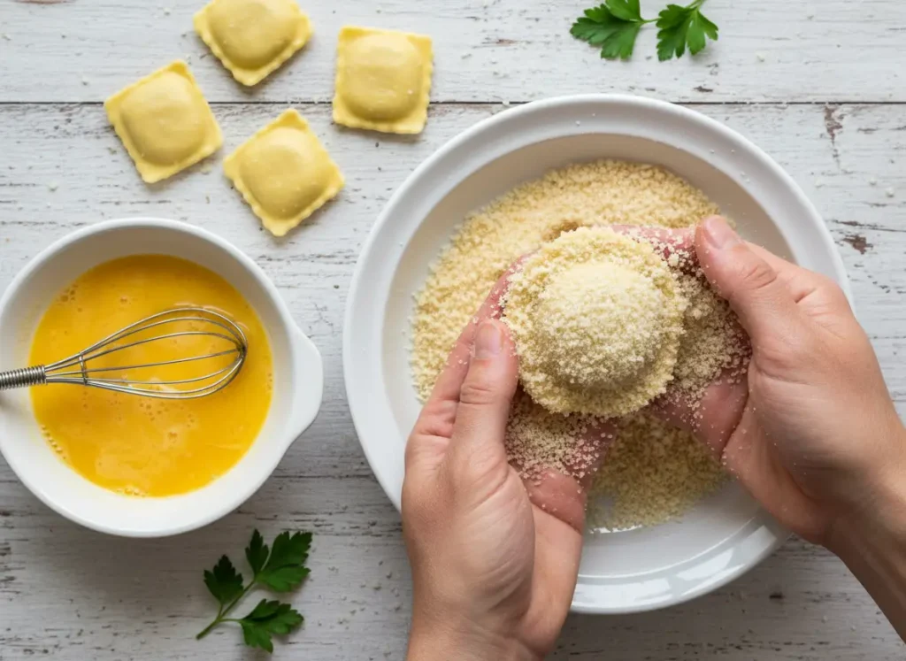We start with the “Dredge Station.” As you whisk the eggs, the yellow should be vibrant. Dip each ravioli into the egg, then into the Panko-Parmesan “snow.” You’ll see the jagged crumbs clinging to the pasta—that’s your “maximalist” foundation. Press them firm. They should look like little breaded pillows.