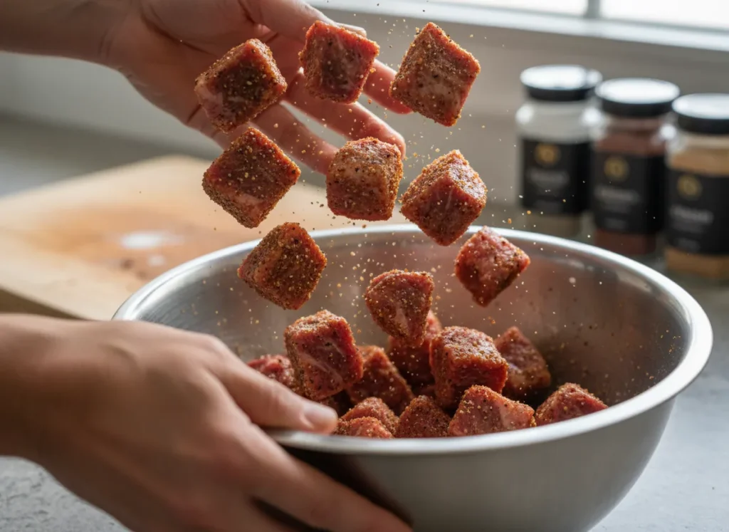 By cutting the steak into bites, we create more surface area for the seasoning to cling to. The air fryer blasts these bites with intense heat, creating a beautiful “sear” on the outside while keeping the inside pink and tender. We finish it with a garlic butter bath that makes it impossible to stop eating.