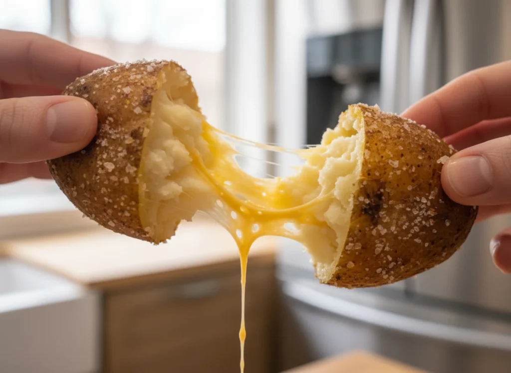 The sound is a sharp, resonant crack—the audible proof of a salt-rubbed potato skin being transformed into a shatter-crisp crystalline wafer by 400°F convection. But the real 2026 victory is the “Gimme Gummy” payload: a velvety, succulent reservoir of fluffy potato and molten cheddar that offers a bouncy, tactile resistance as you bite through the rigid ridges of the skin. This isn’t the limp, oil-saturated, or leathery potato skin of the past. It’s a maximalist sensory event—a collision of an aggressively charred, salt-blasted exterior and a “liquid gold” heart that has been pressure-baked inside its own convection-locked cage.
