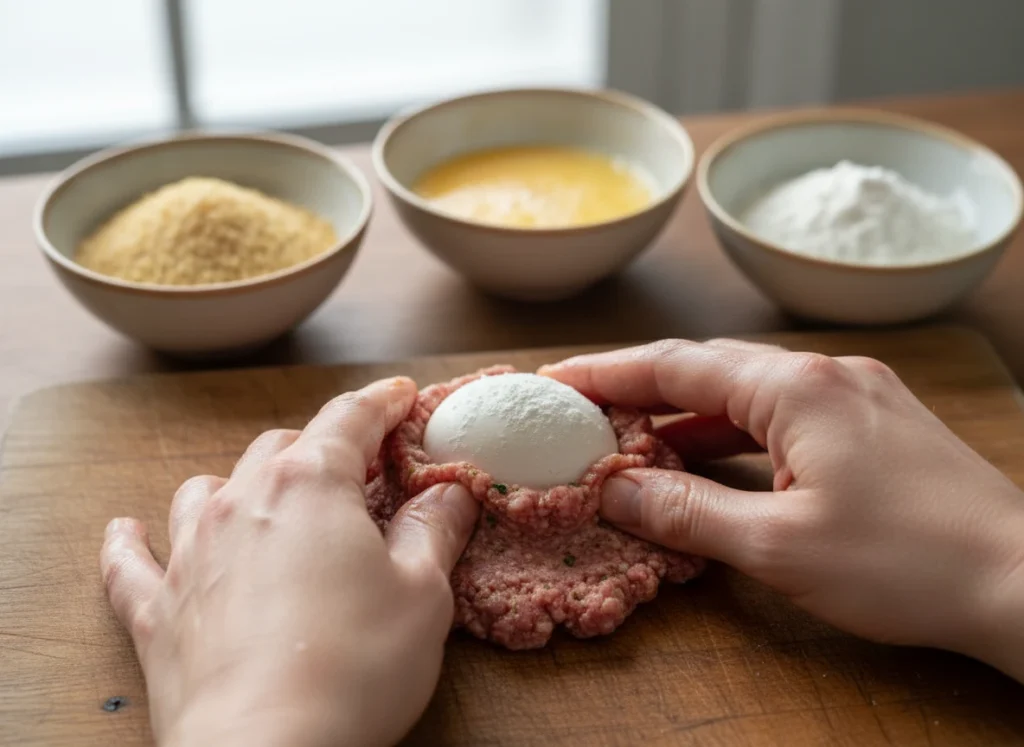- The “Wet Hand” Shaping Hack: Sausage is incredibly sticky. If you try to wrap the egg with dry hands, you will end up in a “maximalist” mess. Dip your hands in cold water before handling the meat; it creates a temporary non-stick barrier that allows you to smooth the sausage into a perfect, uniform shell.