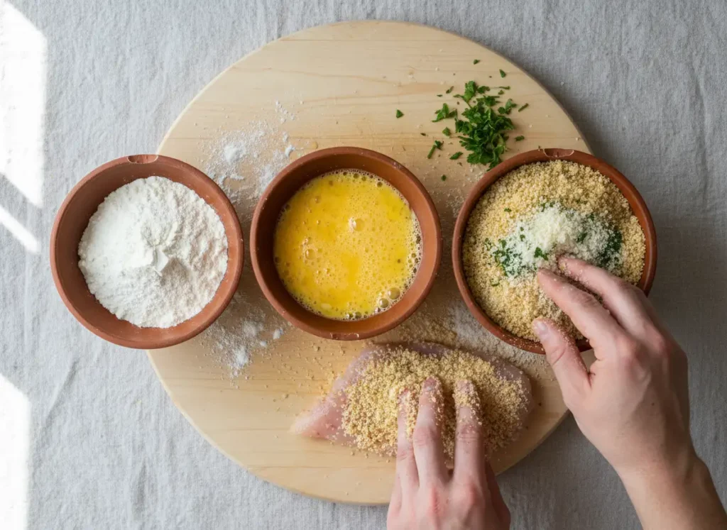 Step 2: The Bread Set up three bowls: Flour, Eggs, Panko mixture. Dip each cutlet in flour (shake off excess), then egg, then press firmly into the Panko/Parmesan mixture to coat.